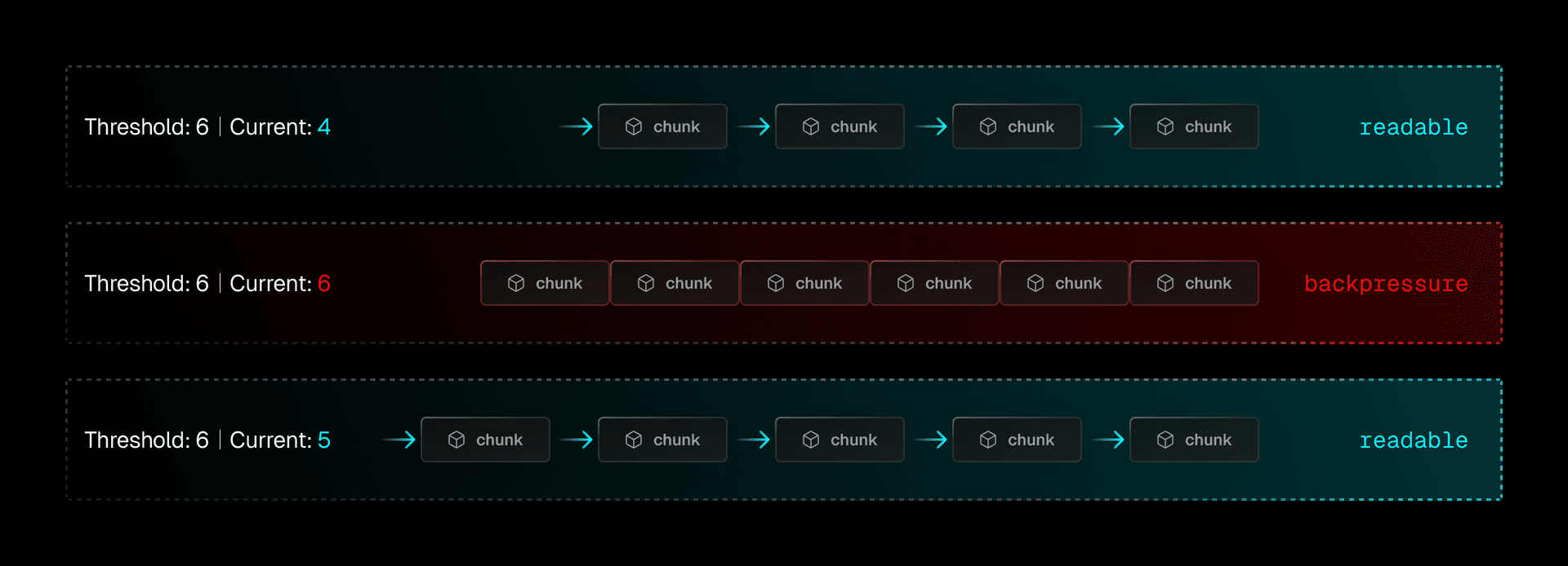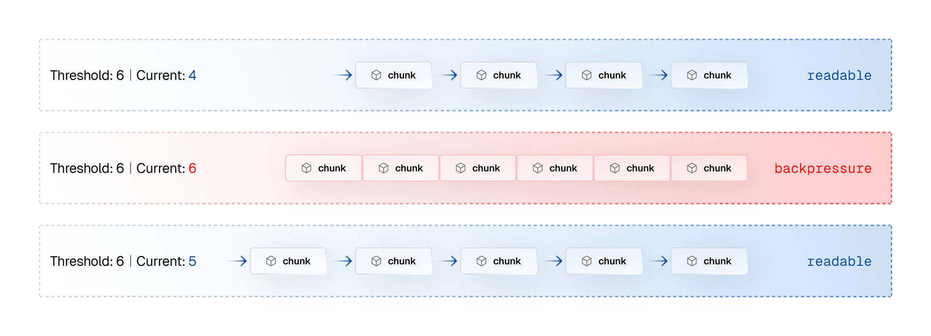 When the consumer starts to catch up, the stream switches back to the "readable" state which resumes the data production. This automatic pause-and-resume mechanism prevents the consumer from getting overwhelmed with data and ensures that the producer doesn't remain idle unnecessarily.