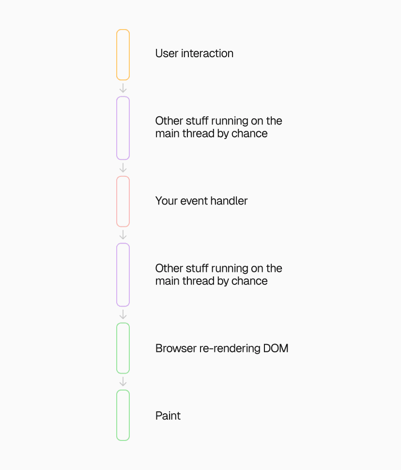 <html> <button onClick={() => { blockTheMainThreadForOneSecond(); }} > Click me </button></html>;The main takeaway is that, to optimize INP, our job is to arrange the work we’re giving to the browser such that it gets a chance to paint and react to user action. What it does not mean is that we always have to get all the work done, that we eventually want to do within the 200ms INP deadline.