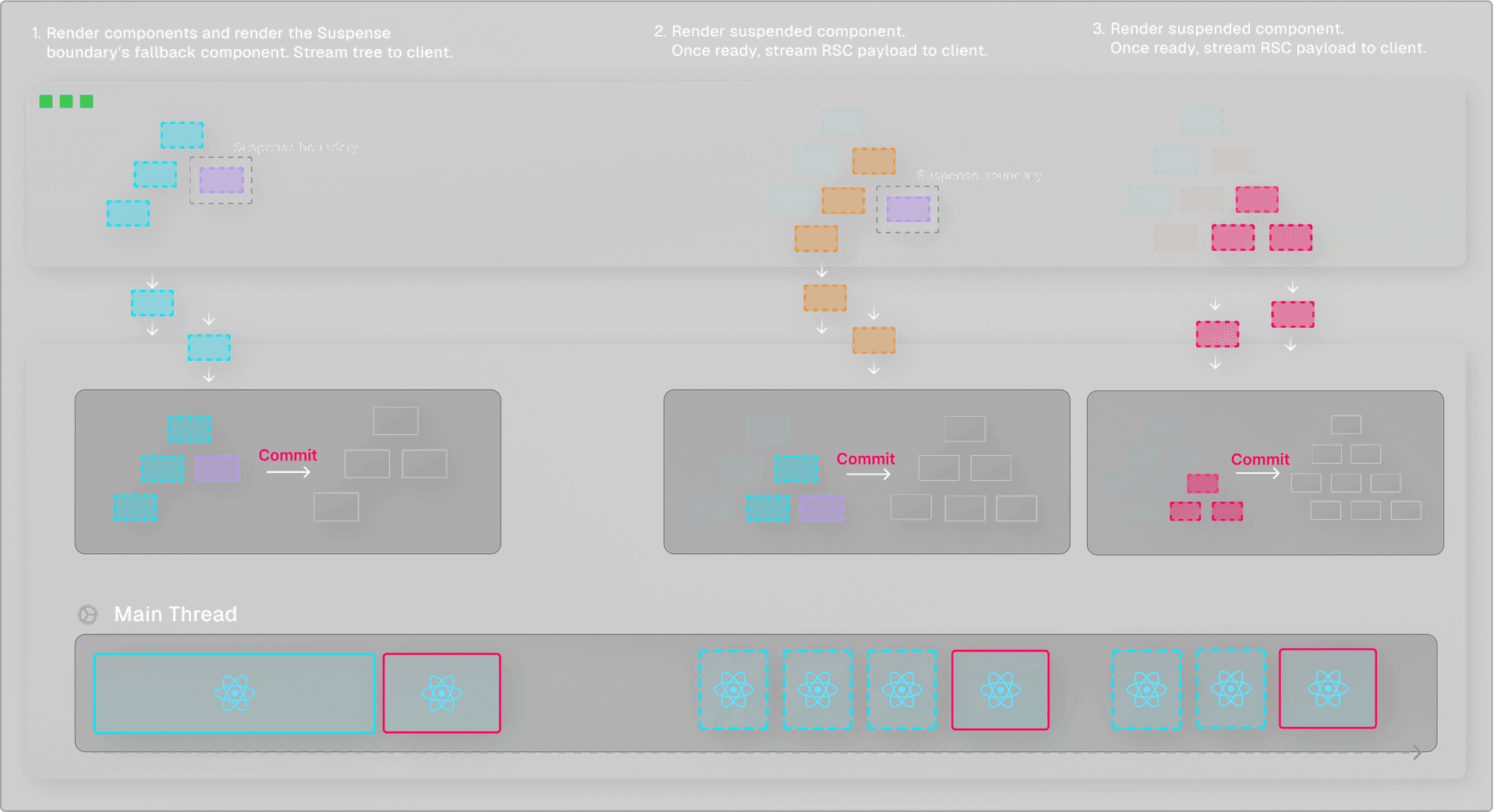 The combination of Suspense with React Server Component’s streamable format allows high-priority updates to be sent to the client as soon as they're ready, without waiting for lower-priority rendering tasks to complete. This enables the client to start processing data sooner and provides a more fluid user experience by gradually revealing content as it arrives in a non-blocking manner.