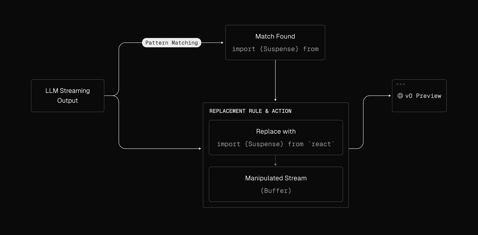 LLM Suspense is a framework that manipulates text as it streams to the user. This includes actions like find-and-replace for cleaning up incorrect imports, but can become much more sophisticated.