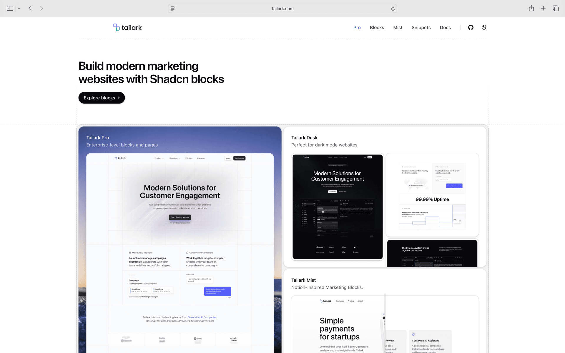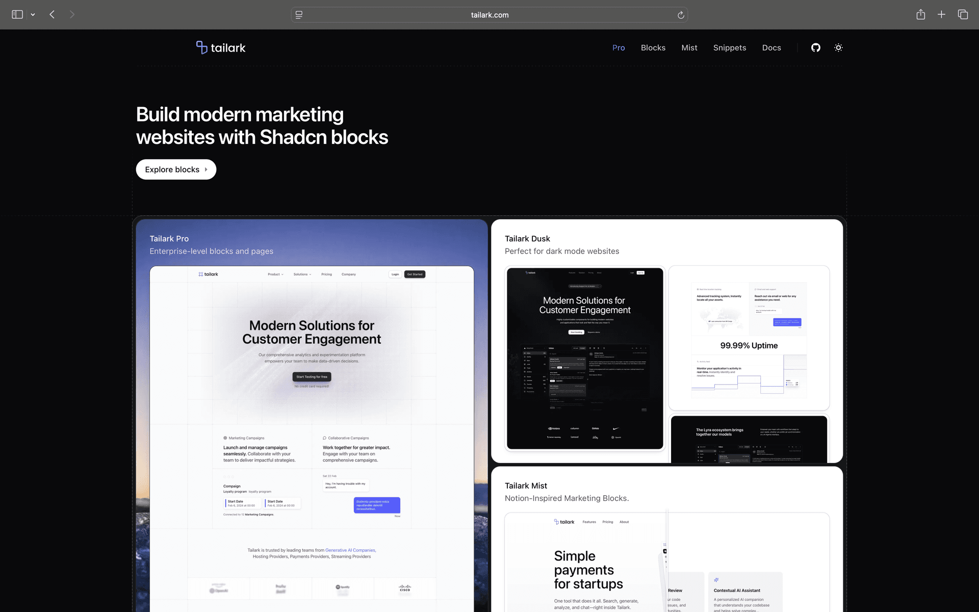 Tailark is a collection of 300+ modern marketing block kits built on top of shadcn UI, offering three distinct visual styles—from default shadcn to Notion-like and minimal—to help teams build polished websites fast. With 1.8K+ GitHub stars, 65,000+ users, and adoption from YC-backed startups, it stands out by being both developer-friendly and design-focused, providing flexible, high-quality blocks that don’t require heavy styling or rigid templates.