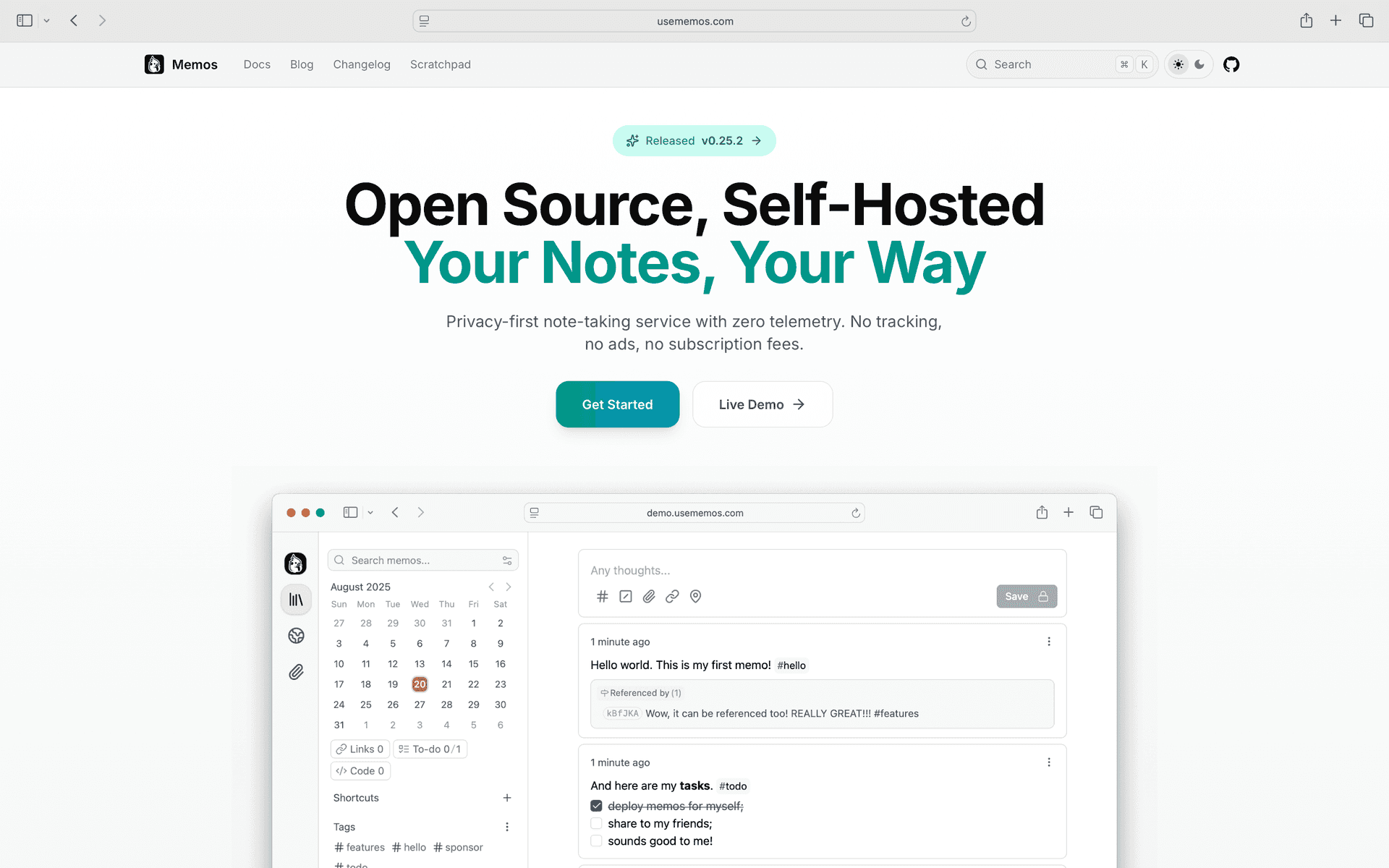 Memos is an open-source, self-hosted note-taking platform focused on simplicity and privacy, empowering developers and creators to capture and share knowledge without relying on cloud services. The project has grown to 44K+ GitHub stars, 400+ contributors, and a highly active global community.