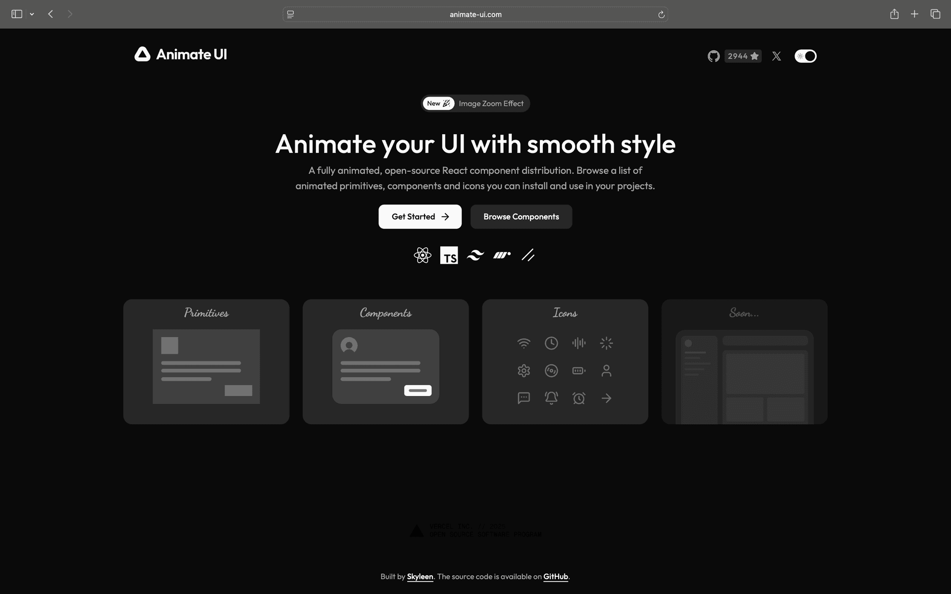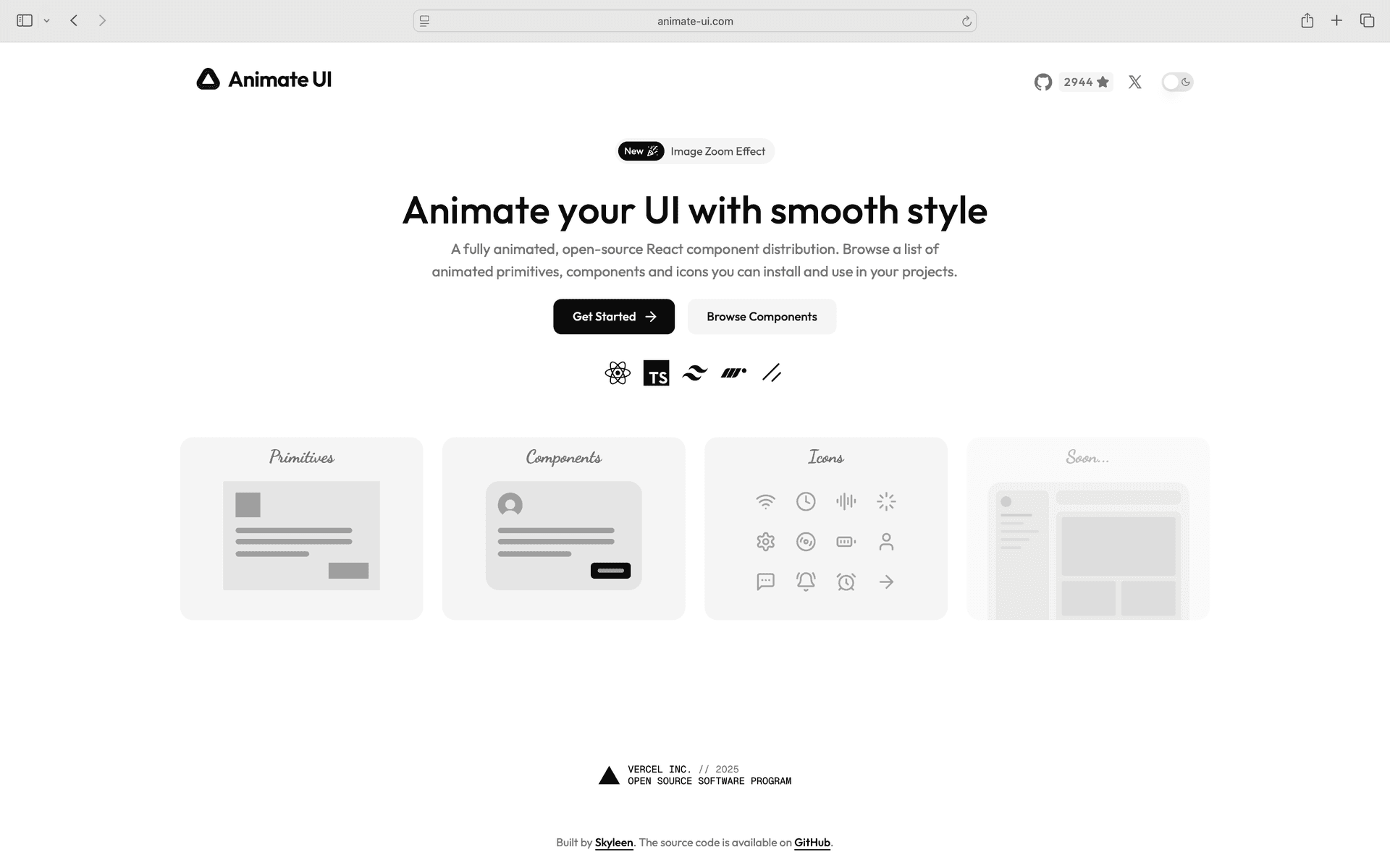Animate UI is an open-source distribution of animated React components built with TailwindCSS and Motion, designed to bring modern, accessible animation to everyday UI. The project has grown to 2,600+ GitHub stars, 3,200+ X followers, millions of monthly edge requests on Vercel, and a thriving community contributing animated primitives, shadcn-style components, and 230+ animated Lucide icons.