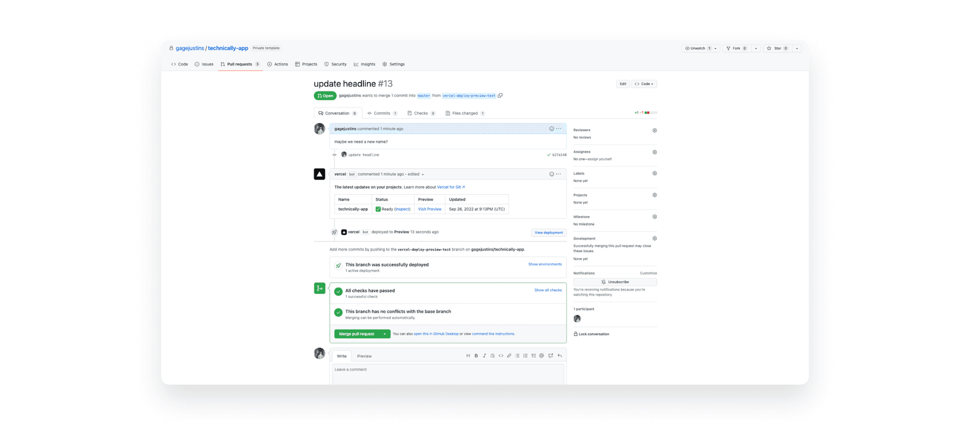 Another really nice feature is deploy previews. When you open a new pull request with changes to your frontend codebase that you’re considering merging / applying, Vercel automatically tries to deploy that code on a new server so you can see how it looks before agreeing to apply those changes. I’m considering a name change for Technically (not really) so I’ve opened up a PR to change the name on the site: