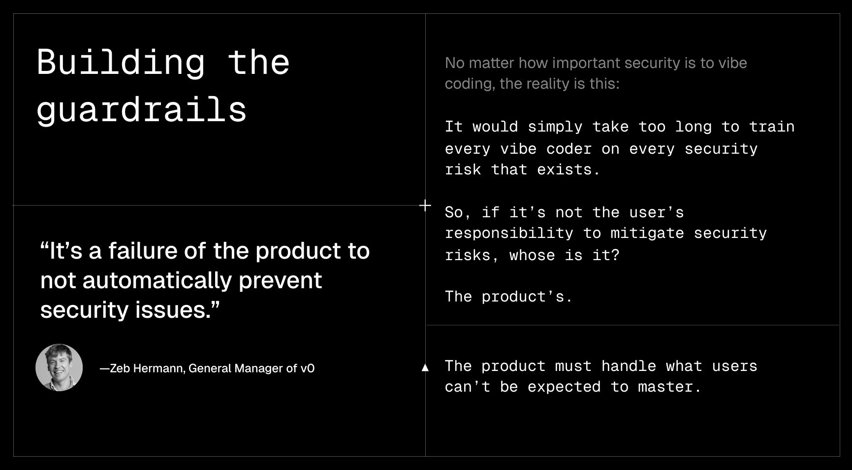 Vibe coding tools must be created to handle the security considerations that users can’t be expected to master. This is especially necessary given the sheer volume of people putting their trust (and sensitive data) into these products.