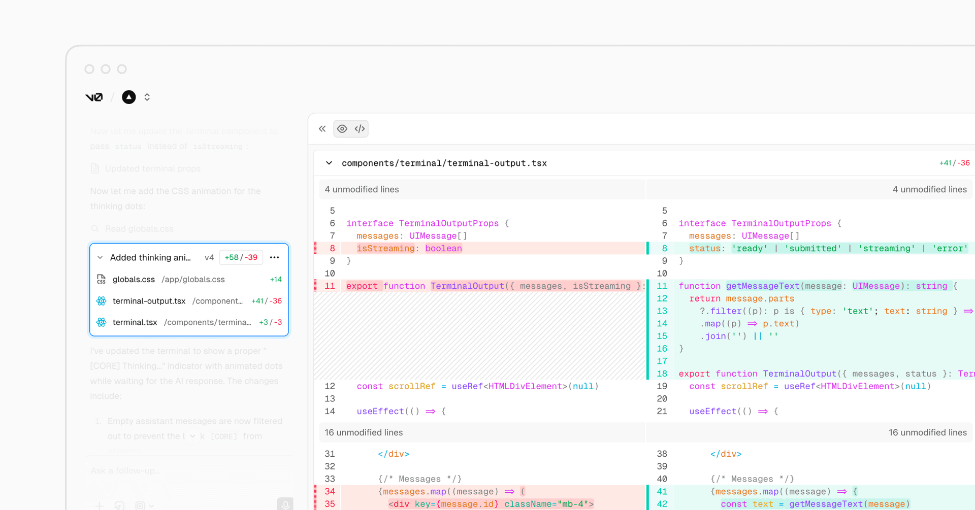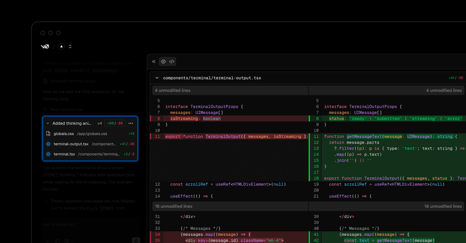 v0 now includes a dedicated diff view to review code changes directly within the interface. You can see exactly what was modified file by file, complete with line addition and deletion counts.