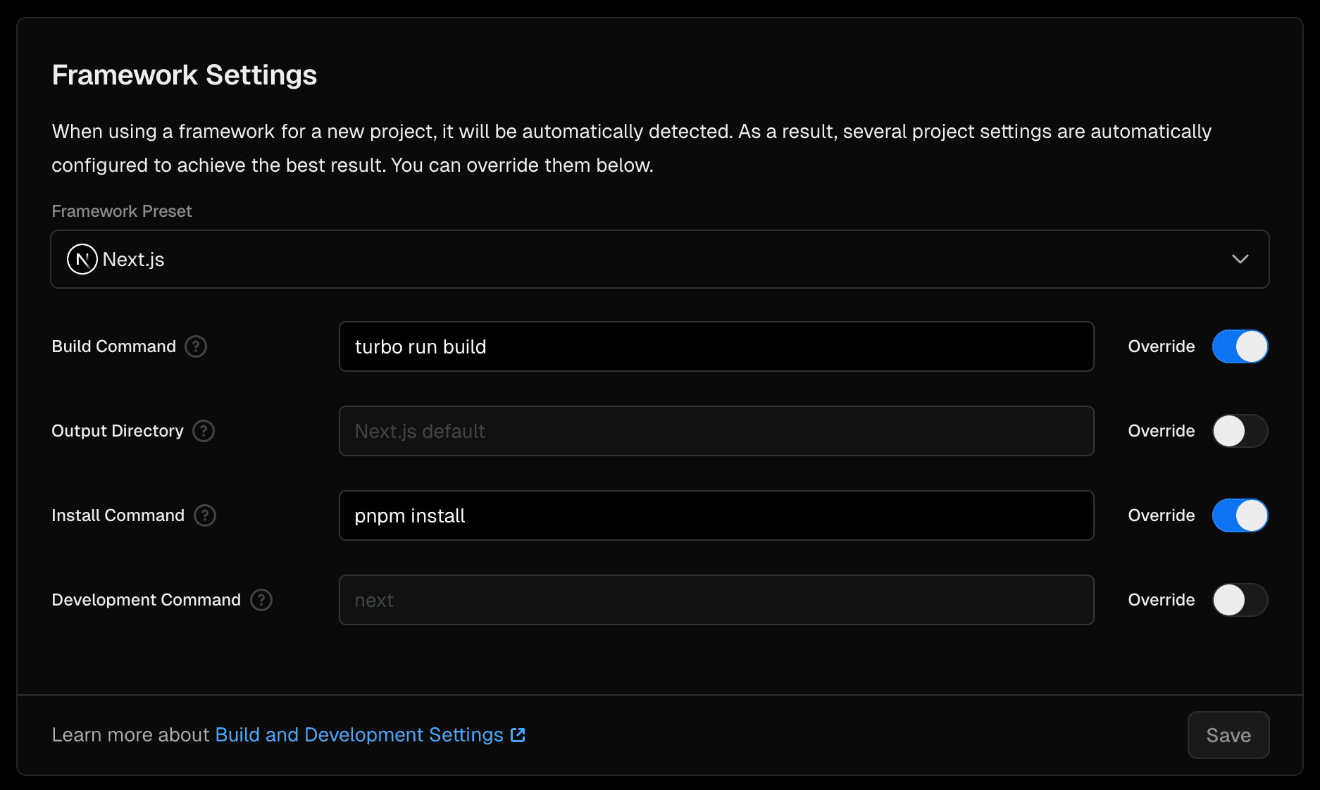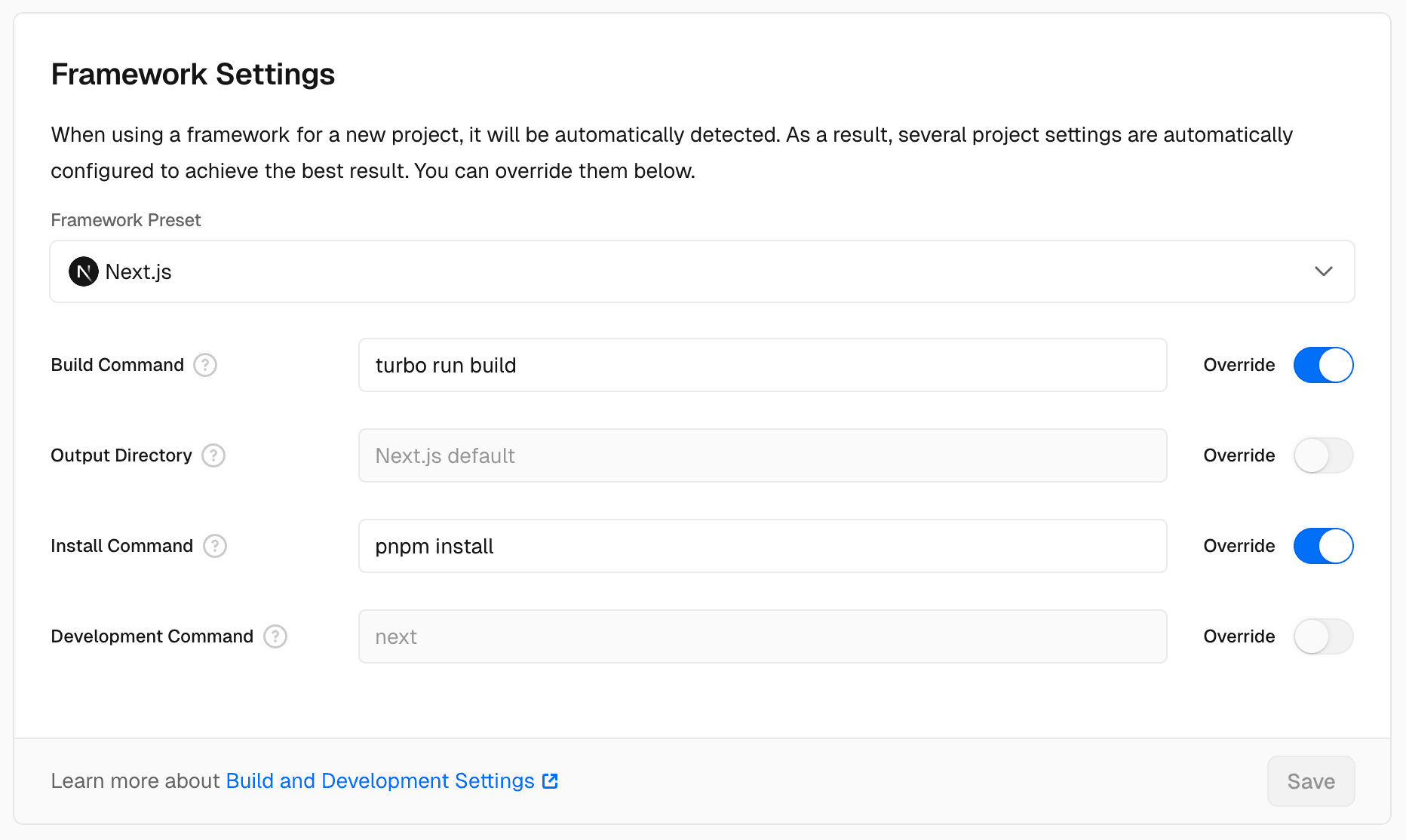 If you'd like to override the Build Command for all deployments in your Project, you can turn on the Override toggle and specify the custom command.