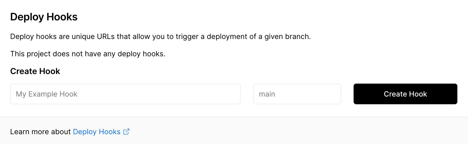When you create a Deploy Hook, a unique identifier is generated in the URL. This allows anyone with the URL to deploy your project, so treat it with the same security as you would any other token or password.