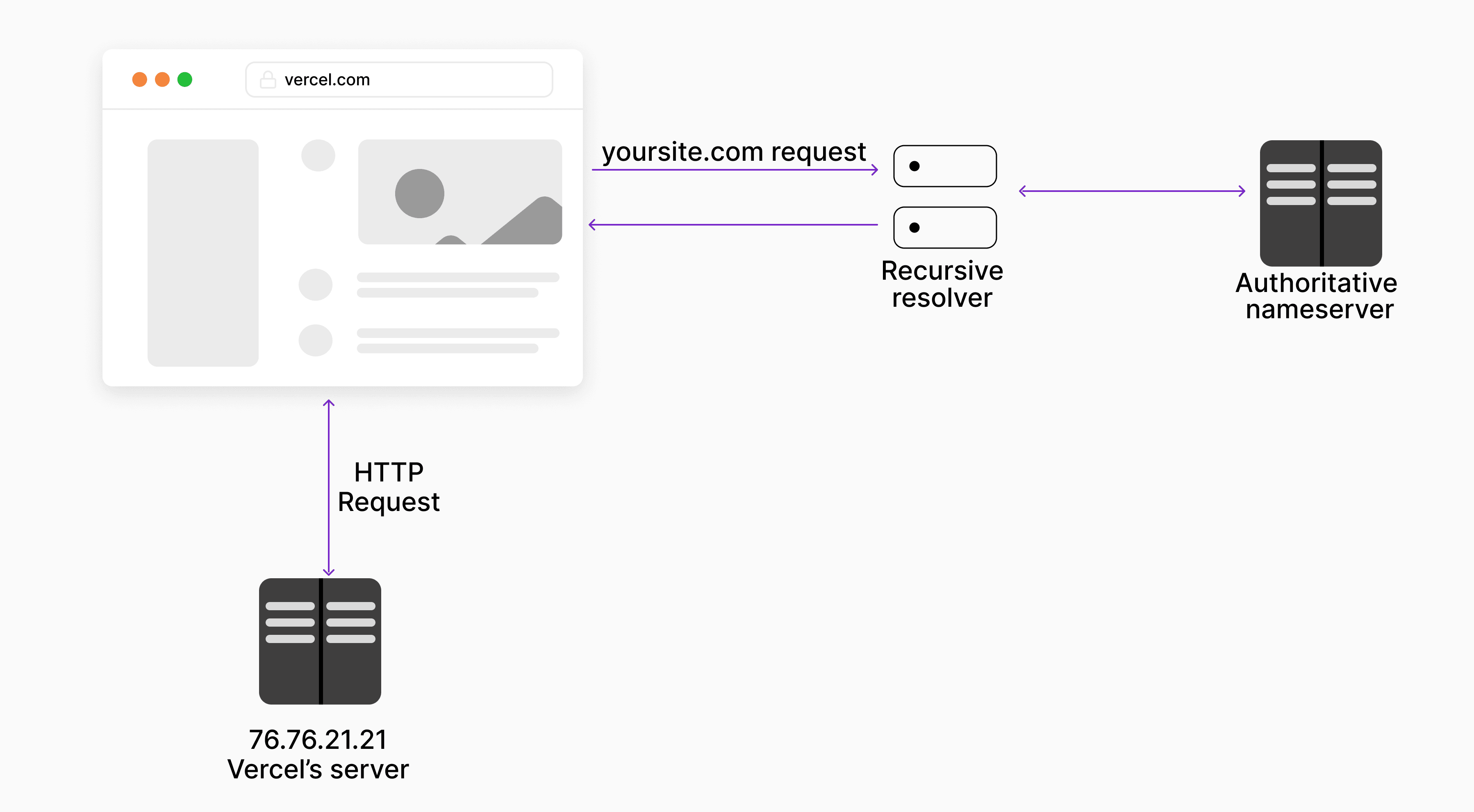 When you've created a Project and deployed it on Vercel, your site lives on Vercel's web servers, which we know to be at the IP address 76.76.21.21. However, your user's browser doesn't know that. For this reason, the browser will perform a DNS Lookup to retrieve the correct IP mapping to yoursiteaddress.com from a DNS server.