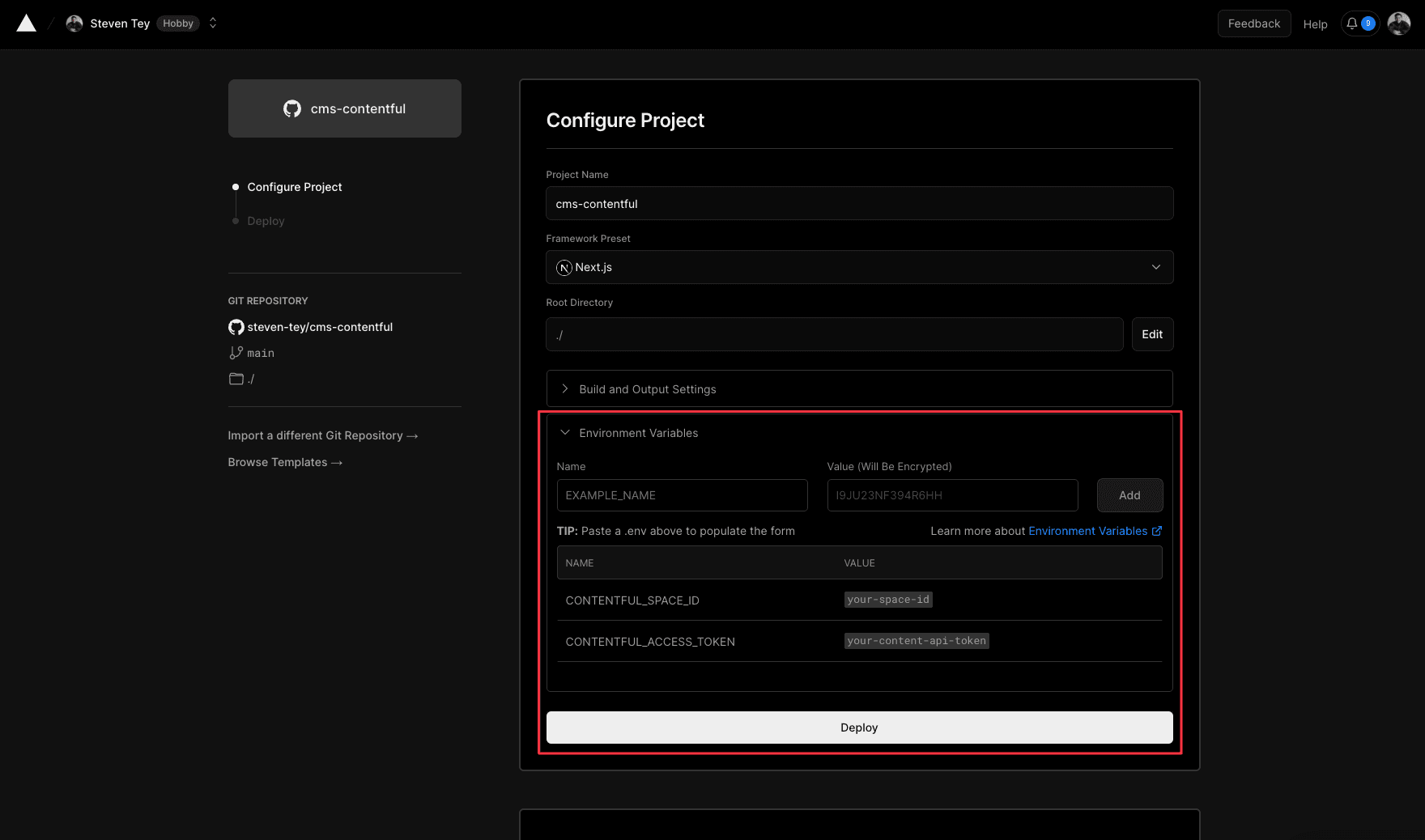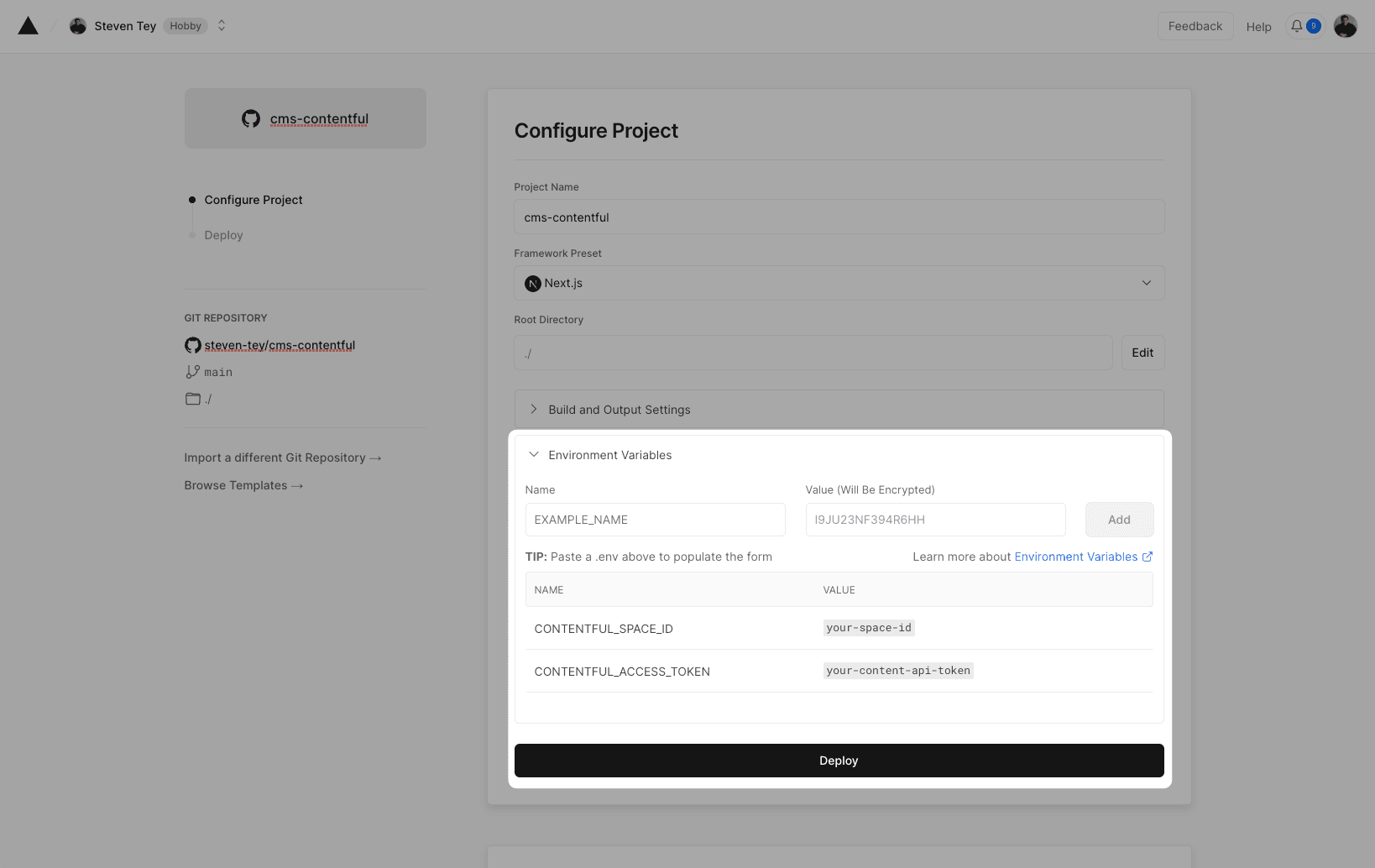 CONTENTFUL_SPACE_IDandCONTENTFUL_ACCESS_TOKENEnvironment Variables from your.env.localfile by copying and pasting it under the Environment Variables section.terminalCONTENTFUL_SPACE_ID='your-space-id' CONTENTFUL_ACCESS_TOKEN='your-content-api-token'