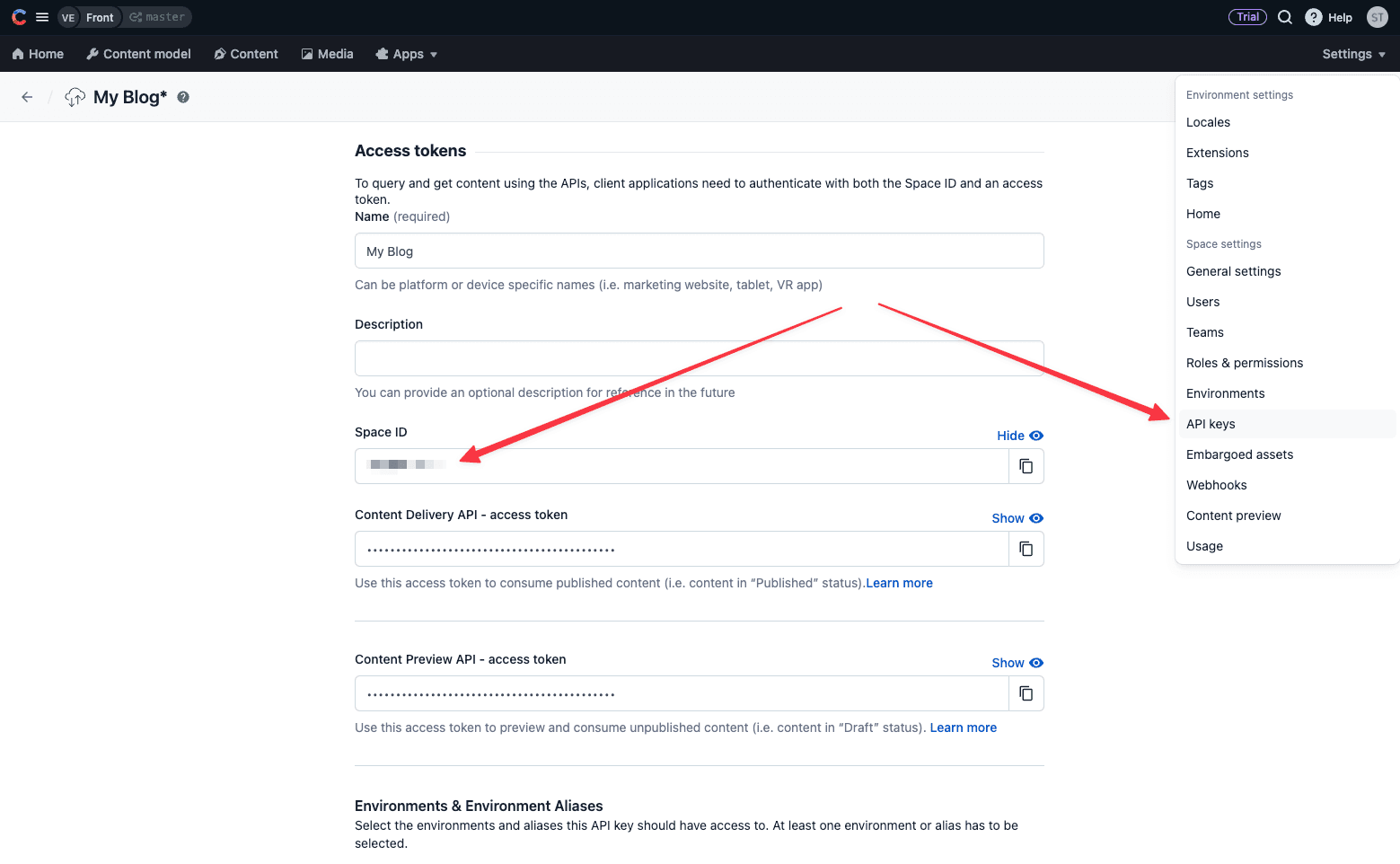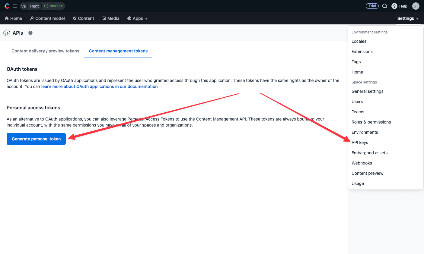 You will also need to create a Content Management API token for Vercel to communicate back and forth with the Contentful API. You can get that by going to Settings > API Keys > Content management tokens.