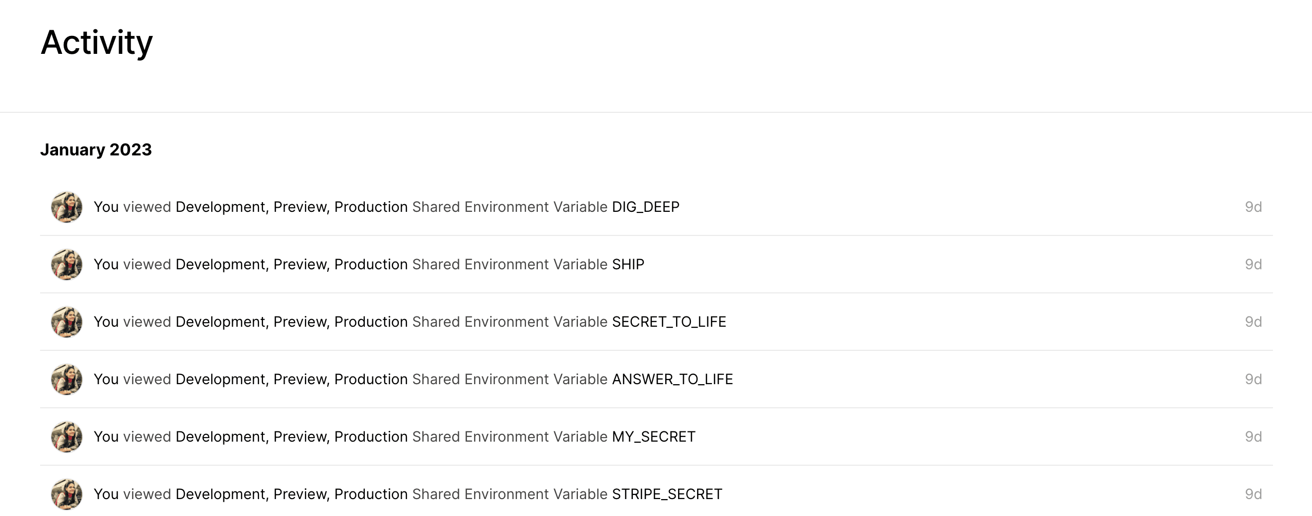 Activity Logs provide chronologically organized events on your personal or team account. You get an overview of changes to your environment variables, deployments, and more.