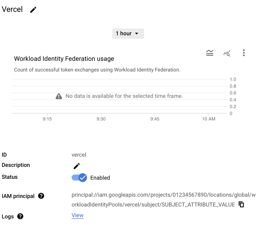 Value Location Environment Variable Example Project ID IAM & Admin -> Settings GCP_PROJECT_IDmy-project-123456Project Number IAM & Admin -> Settings GCP_PROJECT_NUMBER1234567890Service Account Email IAM & Admin -> Service Accounts GCP_SERVICE_ACCOUNT_EMAILvercel@my-project-123456.iam.gserviceaccount.comWorkload Identity Pool ID IAM & Admin -> Workload Identity Federation -> Pools GCP_WORKLOAD_IDENTITY_POOL_IDvercelWorkload Identity Pool Provider ID IAM & Admin -> Workload Identity Federation -> Pools -> Providers GCP_WORKLOAD_IDENTITY_POOL_PROVIDER_IDvercelThen, declare them as environment variables in your Vercel project.