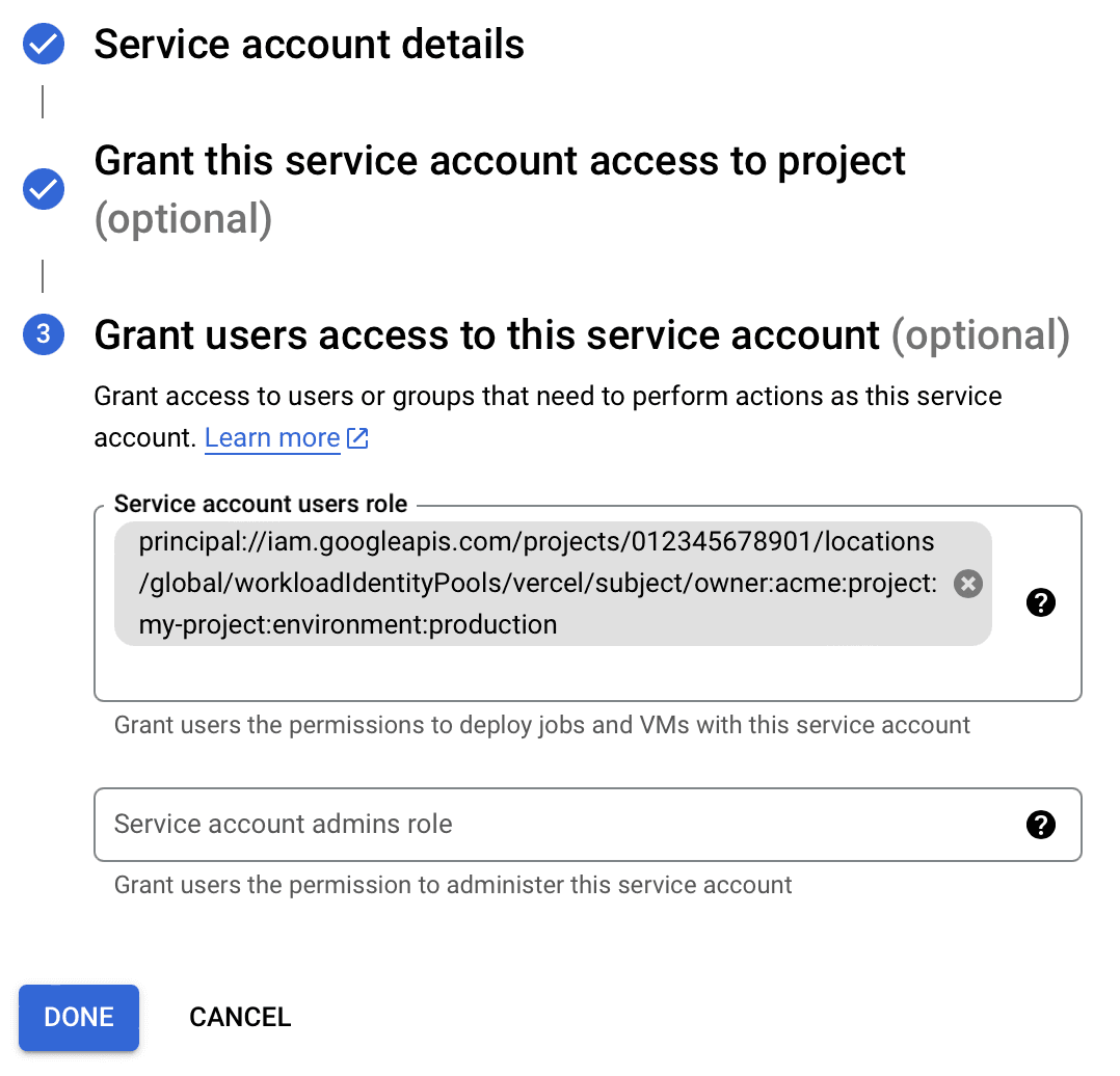 SUBJECT_ATTRIBUTE_VALUEwithowner:[VERCEL_TEAM]:project:[PROJECT_NAME]:environment:[ENVIRONMENT]. e.g.principal://iam.googleapis.com/projects/012345678901/locations/global/workloadIdentityPools/vercel/subject/owner:acme:project:my-project:environment:production. - You can add multiple principals to this field, add a principal for each project and environment you want to grant access to.