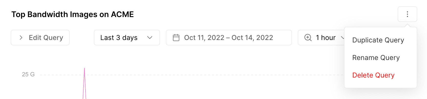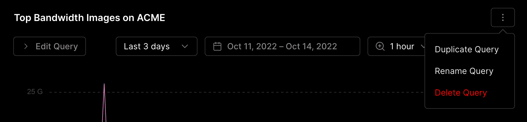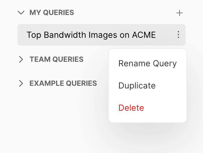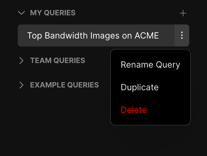 You can manage your saved personal and team queries from the query console. Select a query from the left navigation bar and click on the vertical ellipsis (⋮) in the upper right-hand corner. You can choose to Duplicate, Rename, or Delete the selected query from the dropdown menu.