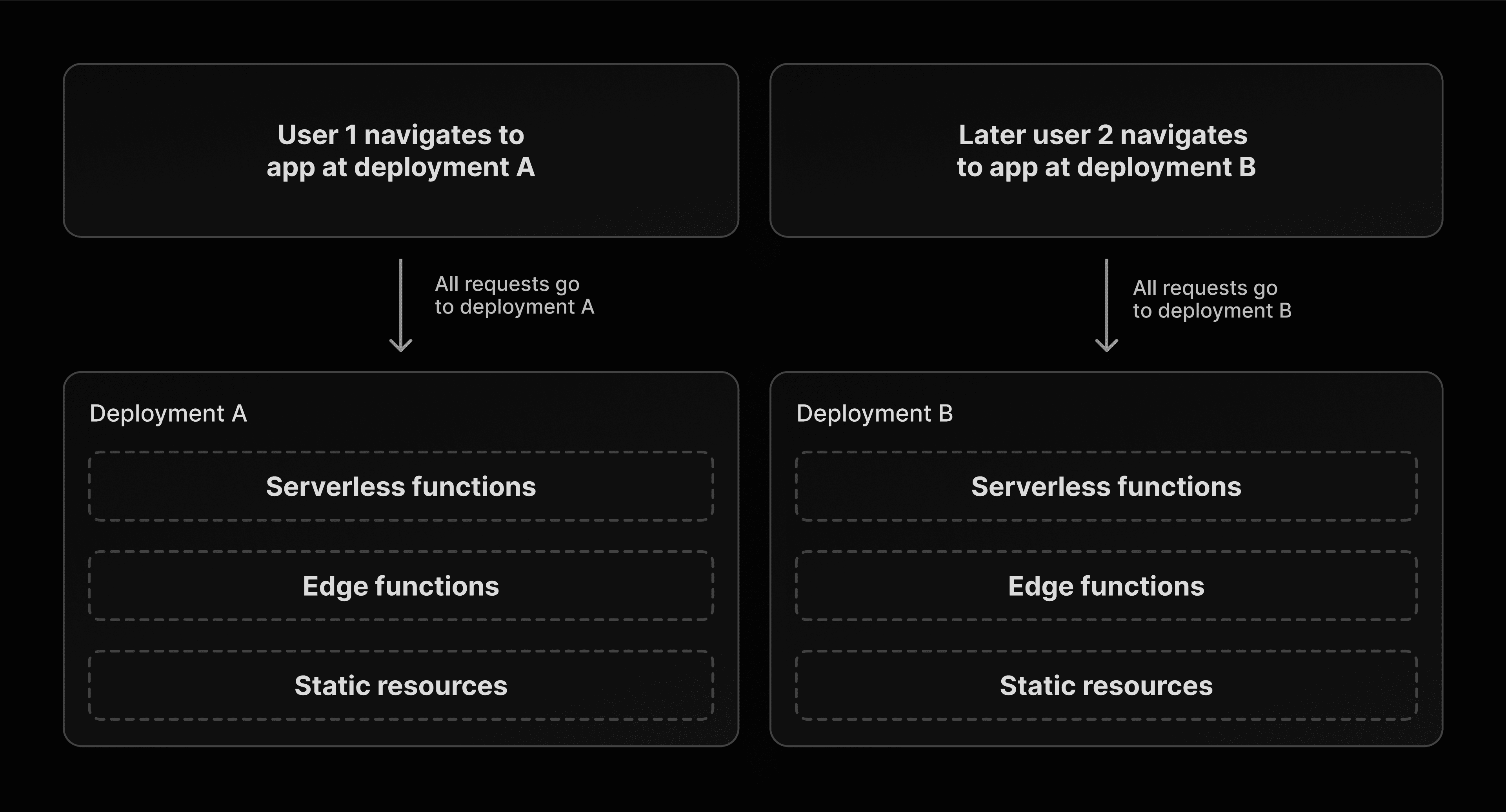Vercel's Skew Protection resolves this problem at the platform and framework layer by using version locking, which ensures client and server use the exact same version. In our example, outdated clients continue to communicate with servers that understand the old data structure, while updated clients use the most recent deployment.