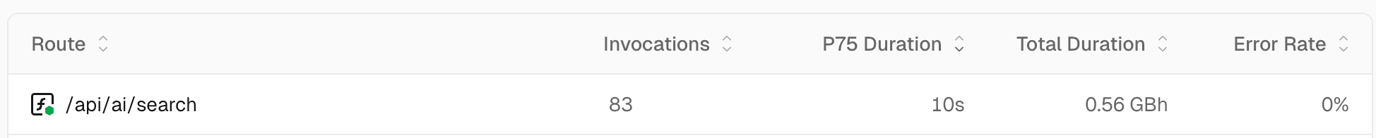 - Advanced Metrics help you understand memory usage, cold starts and TTFB - which can have an effect on the overall consumption of your route.