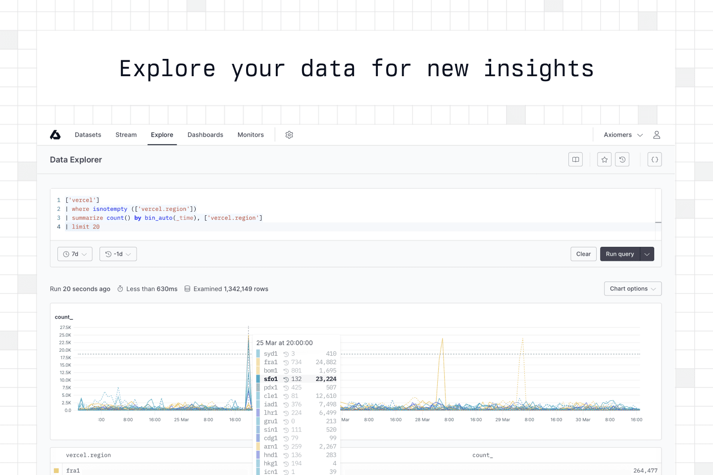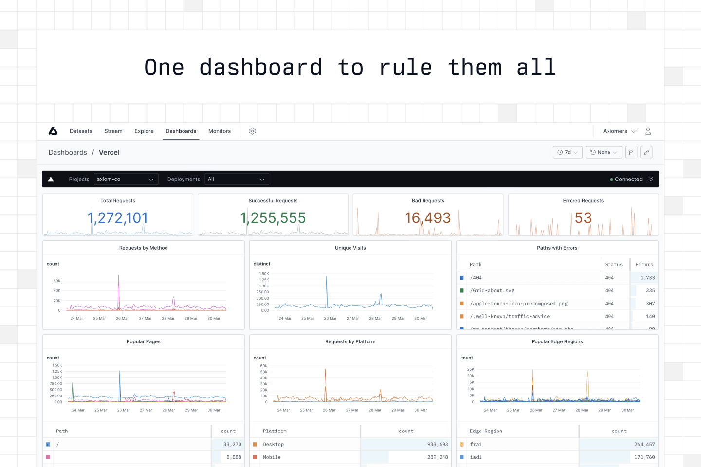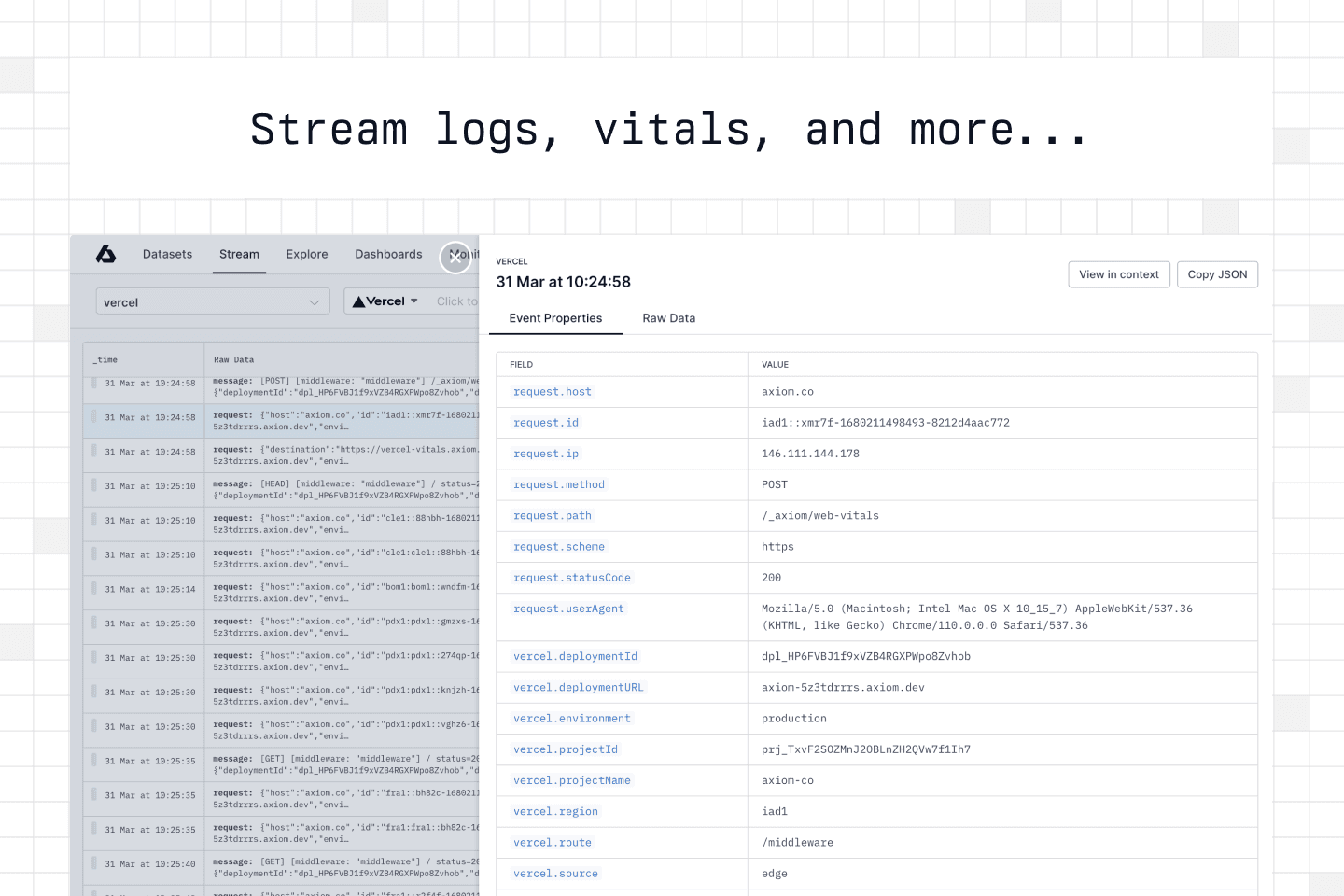 Send structured logs directly from your code and query, stream, & analyze them together with Vercel logs. Create dashboards, setup alerts, share queries with your team, and easily integrate Axiom with other services you use.