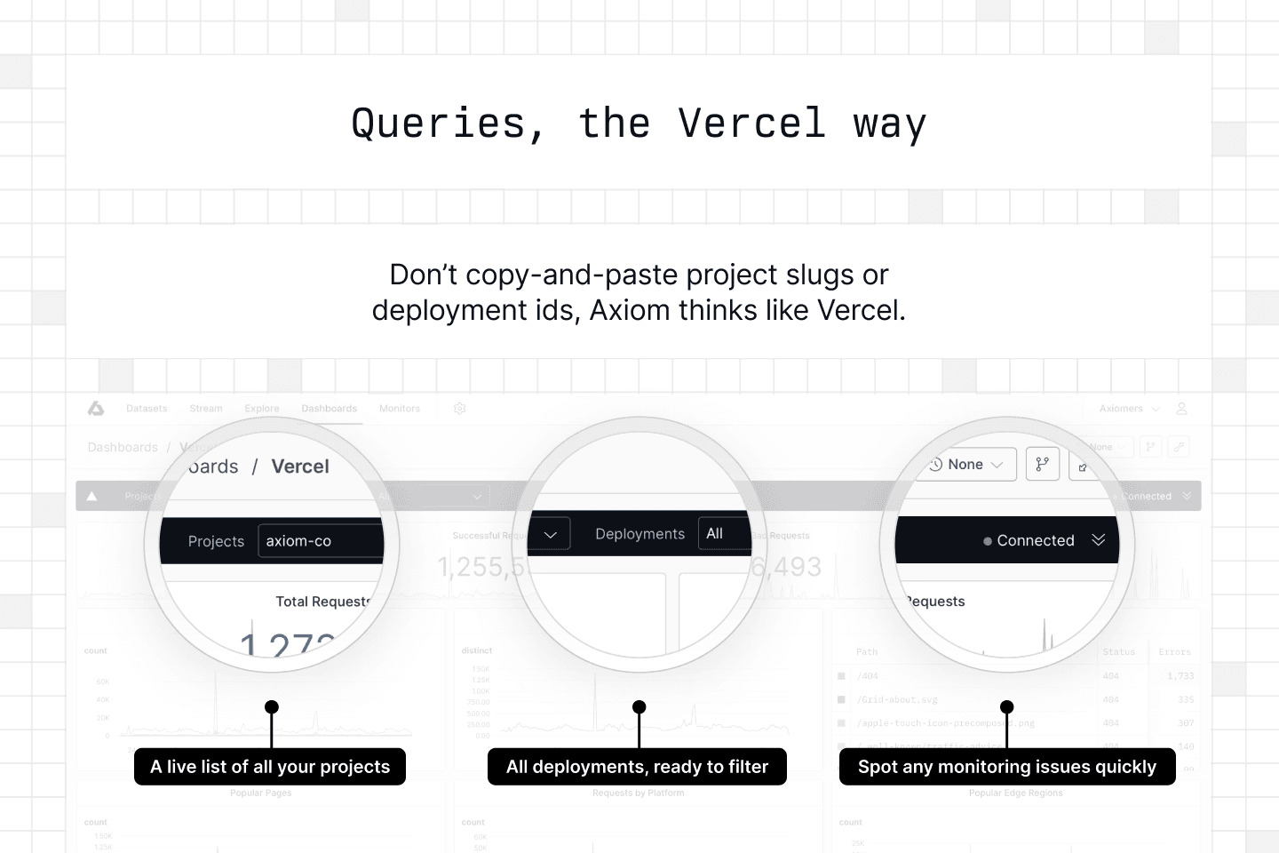 Axiom's Vercel integration enables you to monitor the health and performance of your Vercel deployments by ingesting all your request, function, and web vitals data.