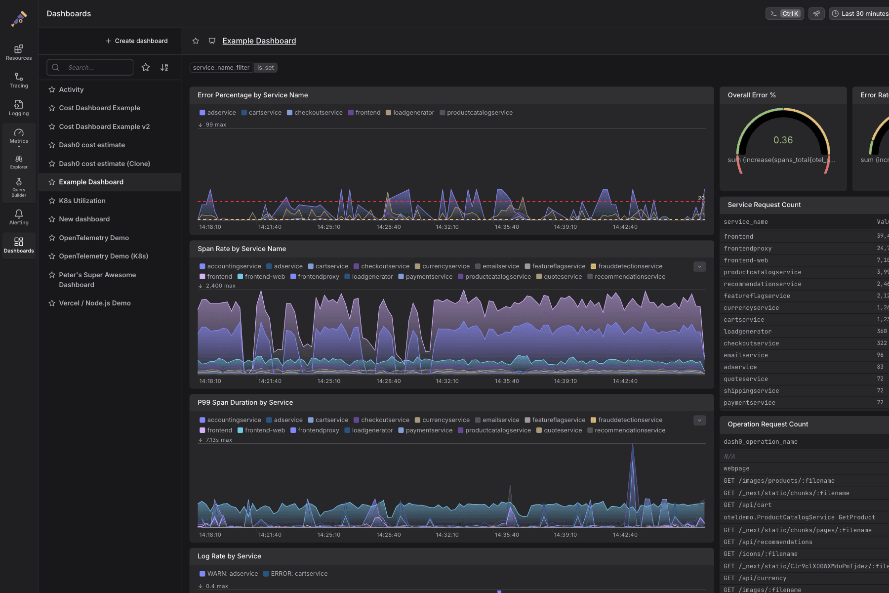When the integration has been installed, logs from your Vercel projects will be sent automatically to Dash0. You can also enable tracing and metrics to gain further insights. Dash0 offers powerful customizable dashboards for your telemetry, alerting capabilities, as well as advanced filtering and analytics features. It also provides 30 days retention for logs and traces and all at a very competitive price.