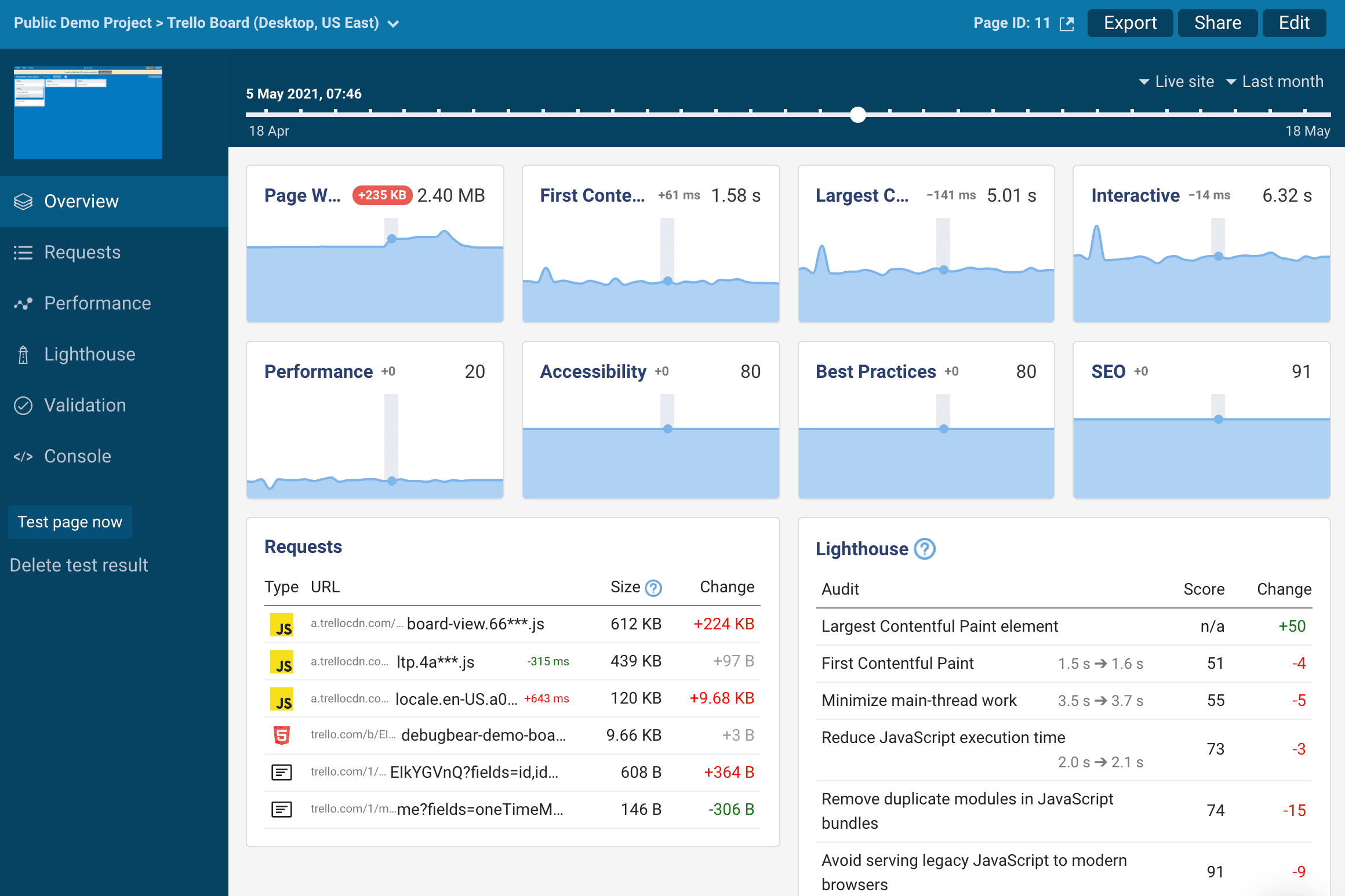 Test the performance of every Vercel deployment and monitor your production site over time.
