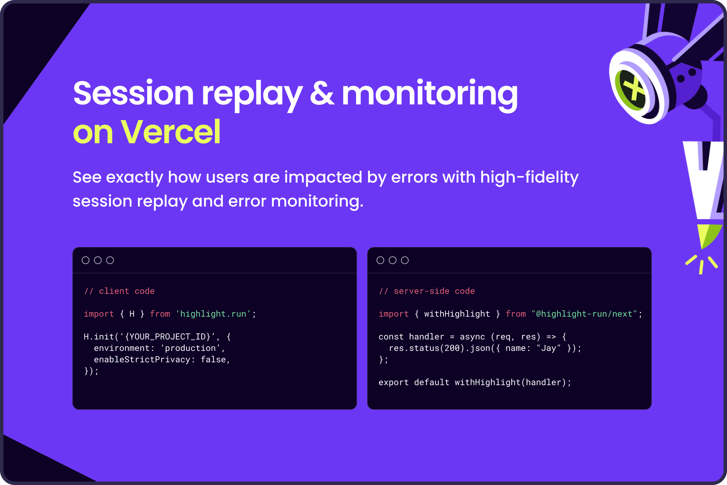 The Highlight Vercel integration is an easy way to connect your Vercel projects to new or existing projects in Highlight.
