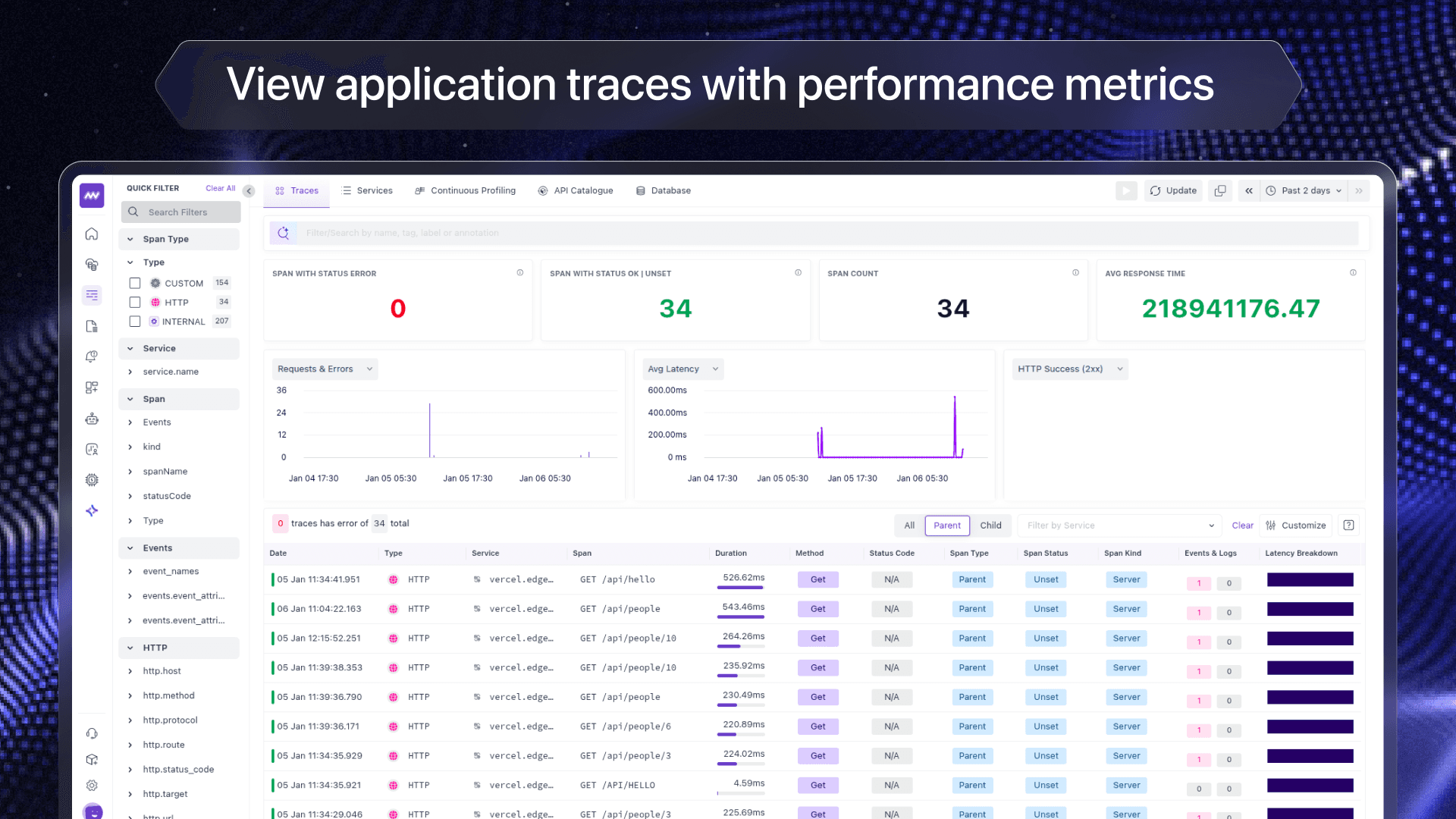 This integration offers a robust APM solution through a unified dashboard with automatic correlation between logs and traces. Monitor all Vercel log sources across production and preview environments, set up alerts, create custom dashboards, and gain insights into performance, latency, and error rates - all without code changes.